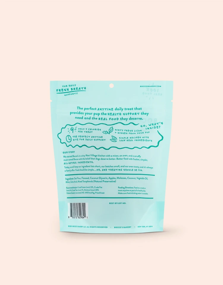 Ingredients: Oat Flour, Flaxseed, Coconut Glycerin, Apples, Molasses, Coconut, Vegetable Oil, Mint, Citric Acid (Natural Preservative), Mixed Tocopherols (Natural Preservative)