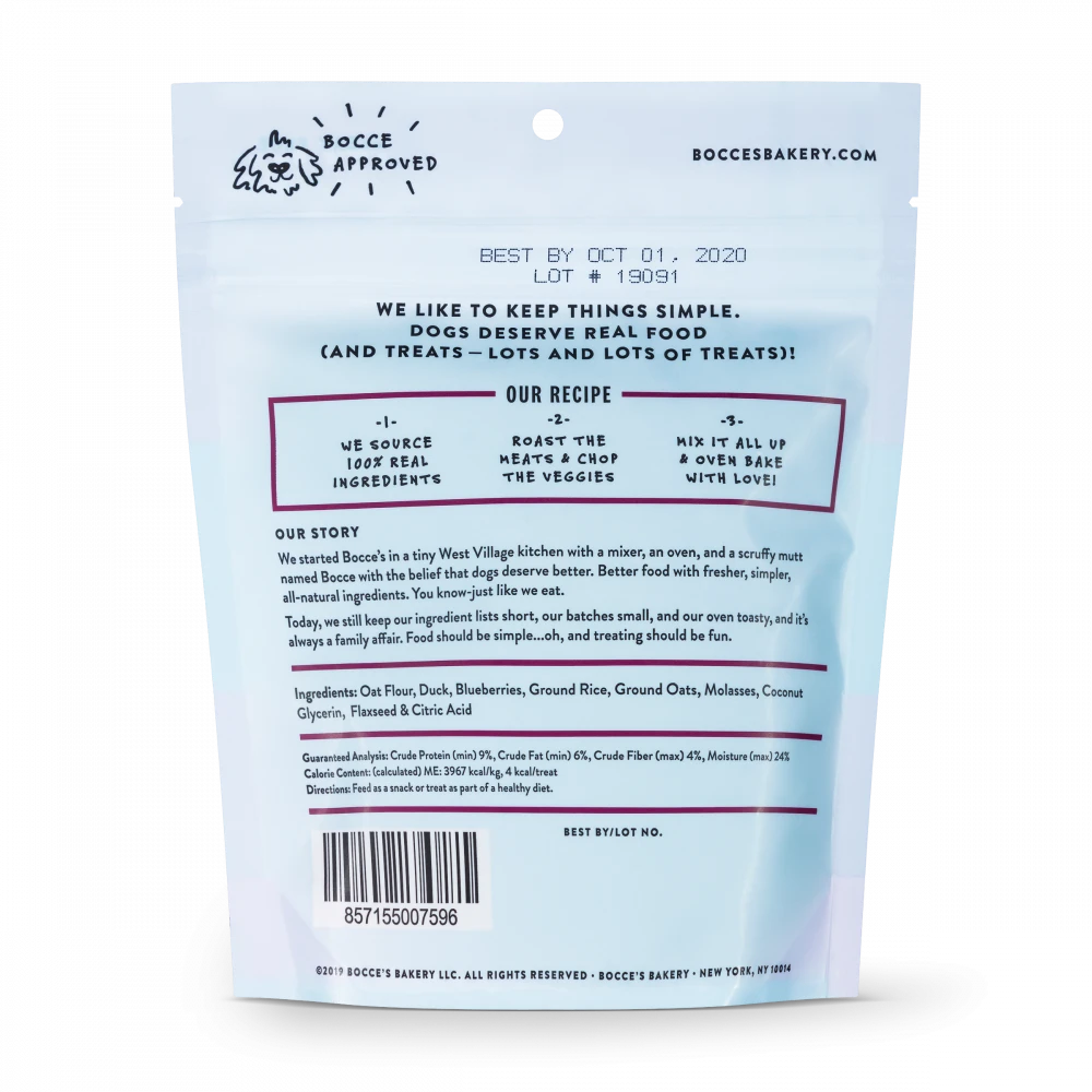 Oat Flour, Duck, Blueberries, Ground Rice, Ground Oats, Molasses, Coconut Glycerin, Flaxseed, Citric Acid..that’s it!