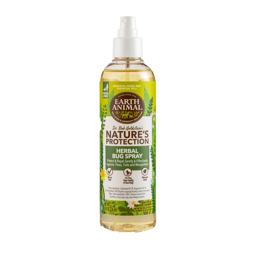 Formulated by Dr. Bob Goldstein, our Nature’s Protection™ Flea & Tick Herbal Bug Spray is infused with a natural blend of aromatic herbs and essential oils that have a fresh, minty fragrance. The preventative power and minty scent of these gentle oils are non-offensive to people and dogs, but loathed by fleas, ticks, and mosquitoes. Our spray is great for hikes, long walks, romps on the beach, boating, or simply lazy days in the yard. We suggest spraying the paws, underbelly, and gently mist the back and neck, daily. You should reapply if your dog swims. Shake well before use to activate the oils. The spray is safe for people too, especially kids, if used as directed.Â
