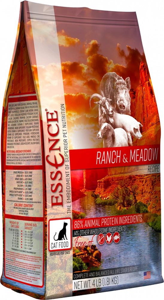 Essence® Ranch & Meadow Recipe is loaded powerful protein that only red meat can provide. Our first four ingredients are boar, goat, lamb, and pork. The recipe is completely grain free, and that promotes a clean, hypoallergenic, diet. It is also backed up with healthy vegetables, such as lentils and pumpkin, which provide additional healthy nutrients and dietary fiber. This is all to ensure your cats are at their healthy best, while eating truly great tasting food. Made with healthy and wholesome ingredients, the Essence® Ranch & Meadow Recipe is truly the Embodiment of Superior Nutrition.