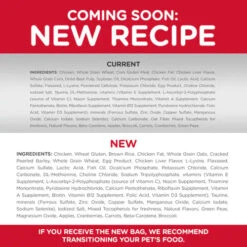 INGREDIENTS: Chicken, Wheat Gluten, Brown Rice, Chicken Fat, Whole Grain Oats, Cracked Pearled Barley, Whole Grain Wheat, Egg Product, Chicken Liver Flavor, L-Lysine, Flaxseed, Calcium Sulfate, Lactic Acid, Fish Oil, Dicalcium Phosphate, Potassium Chloride, Calcium Carbonate, DL-Methionine, Choline Chloride, Sodium Tripolyphosphate, vitamins (Vitamin E Supplement, L-Ascorbyl-2-Polyphosphate (source of Vitamin C), Niacin Supplement, Thiamine Mononitrate, Pyridoxine Hydrochloride, Calcium Pantothenate, Riboflavin Supplement, Vitamin A Supplement, Biotin, Vitamin B12 Supplement, Folic Acid, Vitamin D3 Supplement), Taurine, minerals (Ferrous Sulfate, Zinc Oxide, Copper Sulfate, Manganous Oxide, Calcium Iodate, Sodium Selenite), Iodized Salt, Mixed Tocopherols for freshness, Natural Flavors, Green Peas, Magnesium Oxide, Apples, Cranberries, Carrots, Beta-Carotene, Broccoli.
