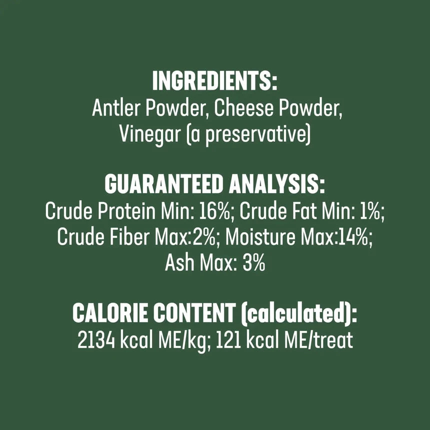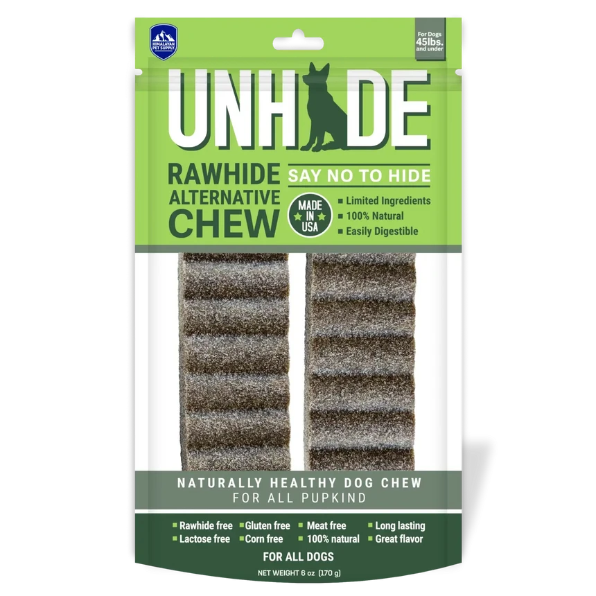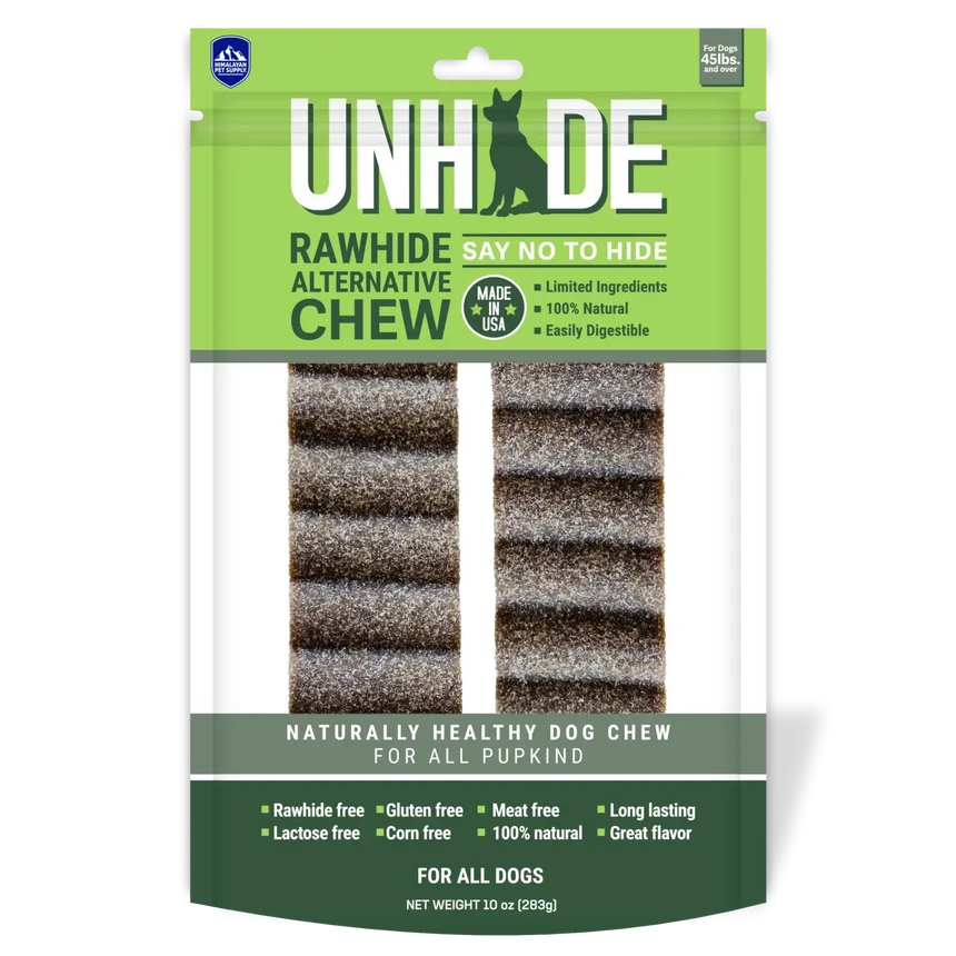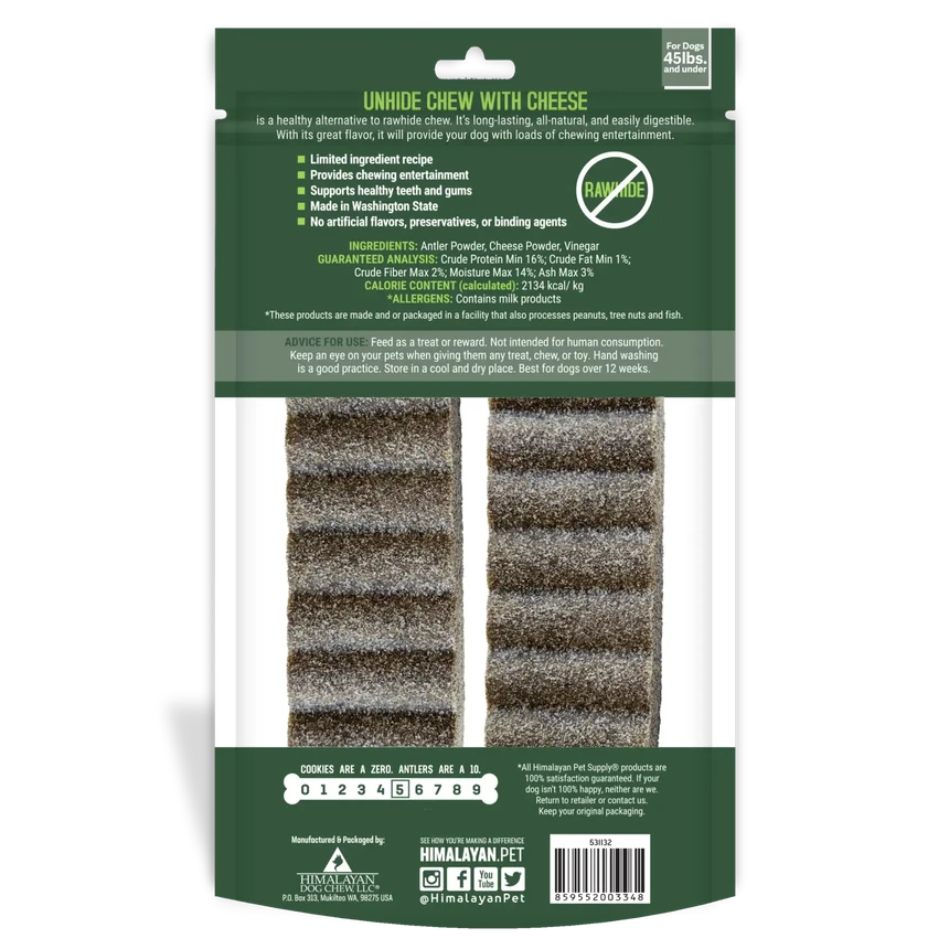 Just say NO to rawhide! Unhide is an innovative natural cheese and antler chew that is long-lasting, all-natural, and easily digestible. With its excellent flavor, you will provide your dog with loads of chewing entertainment. Unhide is proudly handcrafted in Washington State. As a natural alternative to rawhide chews, Unhide is free from lactose, grain, gluten, corn, and soy, and contains absolutely no artificial flavors, preservatives, or binding agents. This limited ingredient recipe is great for dogs of all ages and sizes!