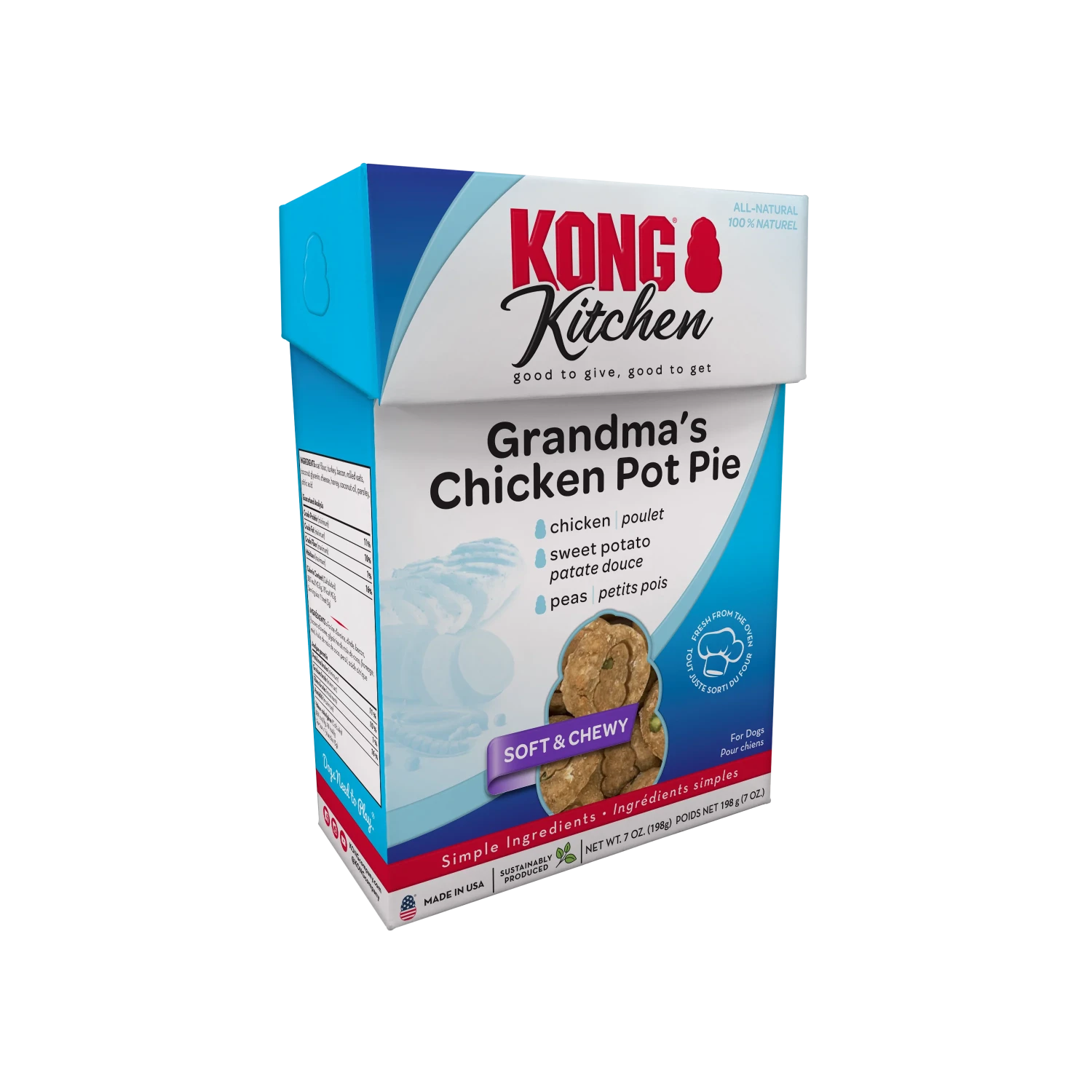 KONG Kitchen Soft & Chewy Grandma’s Chicken Pot Pie bakes real chicken, sweet potatoes, peas and rosemary into irresistibly tasty morsels that are better than belly rubs (well, almost!). these daily delights are oven-baked by a brand you trust using no artificial colors or preservatives, and contain no wheat, corn or soy—just Granny’s favorite wholesome ingredients. Made in the USA with 100% sustainable energy.