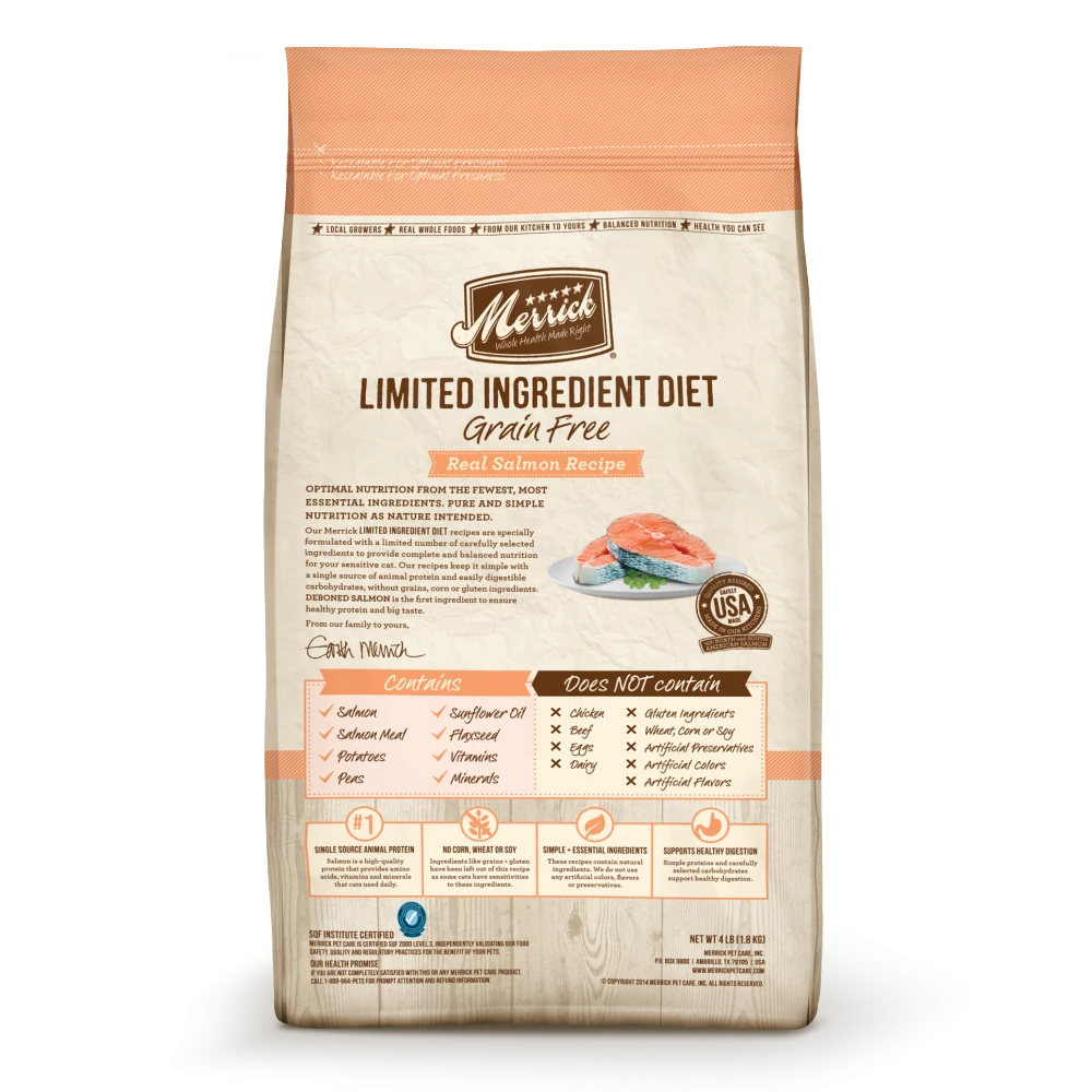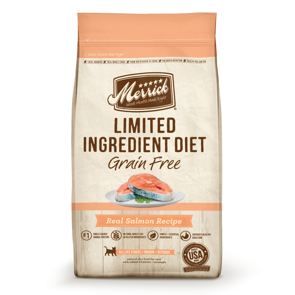 Merrick Limited Ingredient Diet Grain-Free Real Salmon Recipe Dry Cat Food aims to keep it simple with this limited ingredient recipe perfect for cats who may have a sensitivity or allergy towards certain ingredients. Merrick Limited Ingredient Diet Grain-Free Real Salmon Recipe Dry Cat Food contains balanced nutrition from a single source of animal protein and the fewest, most essential natural ingredients. This recipe is free of grains, corn, soy and gluten ingredients. The single source of protein helps to support healthy digestion and the high amounts of omega fatty acids promote the health of your cat’s skin and coat.