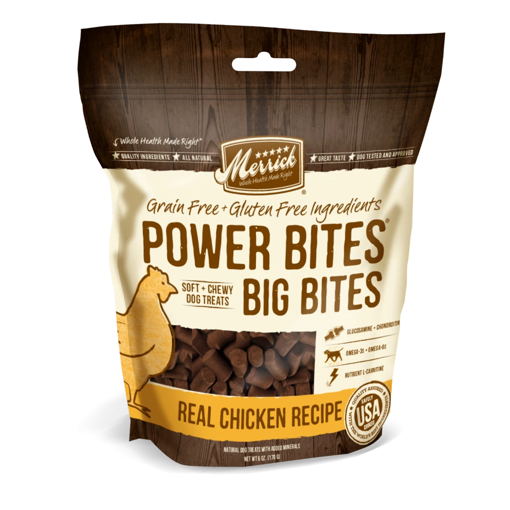 Merrick Power Bites are soft and chewy natural treats, with big taste and significant levels of powerful protein packed into every bite. Merrick is excited to now offer Big Bites for large breed dogs. Larger star-shaped treats are perfect for training and rewarding large-breed dogs. In addition to bigger bite sizes, Big Bites include glucosamine for hip and joint health, as well as Omega 3 and Omega 6 fatty acids that support healthy skin and coat. Big Bites are grain-free and gluten-free, without sorbic acid.