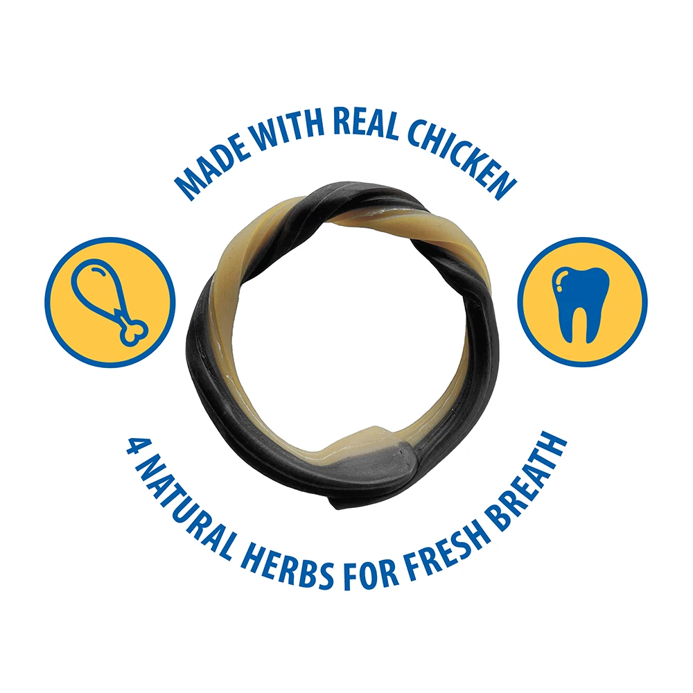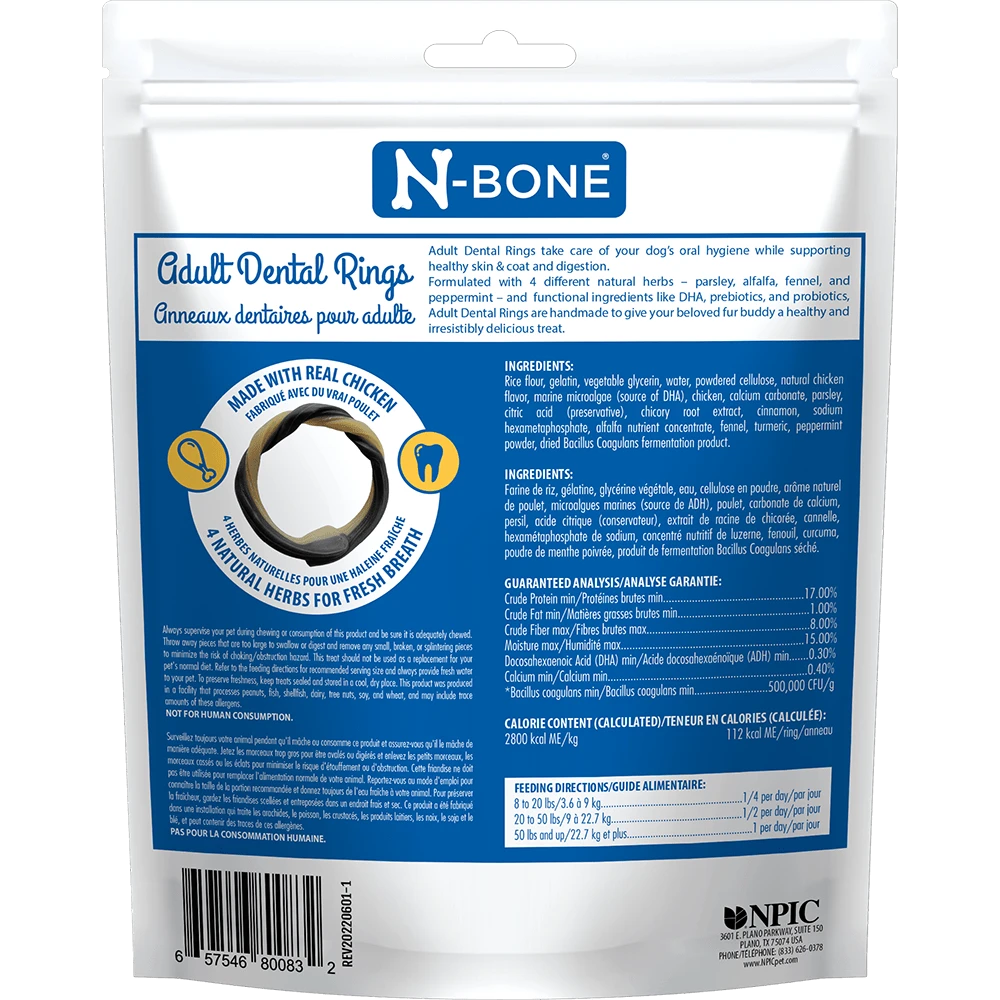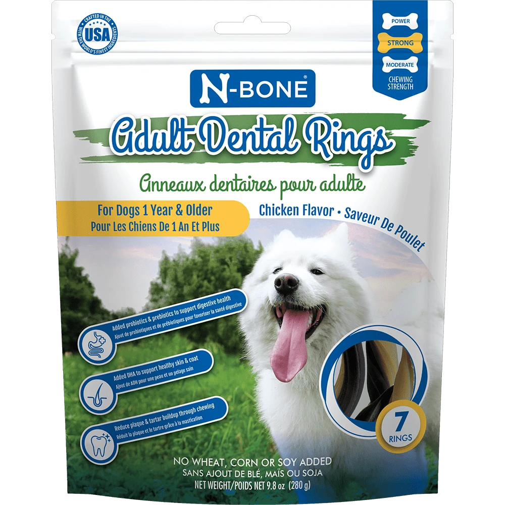 The N-BoneĀ® Adult Dental Rings are finally here! Available in the original, pup-favorite chicken flavor, the Adult Dental Rings are fortified with functional ingredients like DHA, probiotics, and prebiotics to support healthy skin & coat and digestion, which are critical to a dogās health during the adult years.Ā Each ring is handcrafted with care in the USA and contains no wheat, corn, or soy. The strong texture, as well as 4 natural herbs ā parsley, alfalfa, fennel, and peppermint ā provide necessary dental function as they reduce plaque and tartar buildup through chewing and freshen the breath.Ā The same unique shape and the same great flavor as the N-BoneĀ® Puppy Teething Rings. Because we know, sometimes, they just donāt want to grow up and are still puppies at heart.