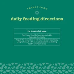 DAILY FEEDING DIRECTIONS For ferrets of all ages. Fresh food should always be available. Replenish food daily. Adjust the amount as needed to maintain ideal body weight. Consult with your veterinarian if underlying health conditions exist.