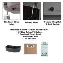 The Petmate® Small Sky Kennel® is the ideal kennel for your pet’s comfort and security. This heavy-duty 21″ kennel features high- strength plastic construction, durable wire doors that interlock for added security, 360-degree wire ventilation windows to promote healthy air flow, non-corrosive plastic wing-nuts for durable assembly. and secure easy to operate door latches for safety. The Sky Kennel is considered the gold standard for pet travel allowing your pet to feel at home even when traveling. Each kennel includes “Live Animal” identification labels and a dual food and water cup. The Sky Kennel is also eco-friendly and made from recycled materials. Meets most air travel requirements. Please contact your specific airline before traveling for verification of their specific requirements. Plastic made in the USA, handle and other components imported.