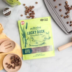 Polkadog dehydrated duck liver dog treats. Handmade daily in our Fish Pier kitchen with locally sourced U.S. duck liver and natural potato flour, nothing says decadence quite like these crunchy, grain-free nuggets. Perfectly show-sized-for-training on the go, these precious gems are a veritable bowl of unicorns and rainbows.