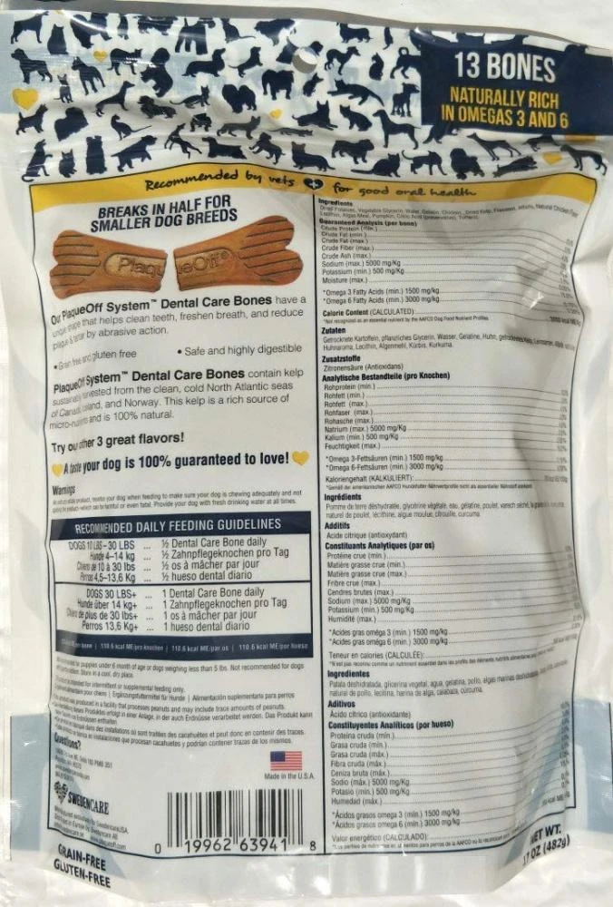 ProDen PlaqueOff® Dental Bones are dog chews with the PlaqueOff System® which help clean plaque and tartar by abrasive action. Used daily, this natural product made with sea kelp can complement ordinary dental hygiene. Available in five tasty flavors. Choose between Turkey & Cranberry Flavor, Chicken & Pumpkin Flavor, Bacon Flavor, Bison & Apple Flavor and Vegetable Fusion Flavor.