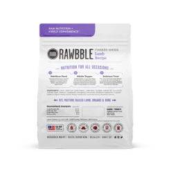 Delicious and nutritious, our RAWBBLE Freeze Dried Food for Dogs combines the whole-animal nutrients of raw food with the convenience of kibble. RAWBBLE is 98% meat, bones and organs to provide your pup with a healthy source of protein and to help give them healthy teeth and gums too. RAWBBLE uses freeze-dried technology to lock more naturally sourced essential nutrients into every bite.