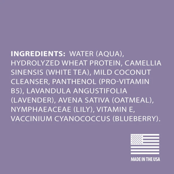 Water (Aqua), Hydrolyzed Wheat Protein, Camellia Sinensis (White Tea), Mild Coconut Cleanser, Panthenol (Pro-Vitamin B5), Lavndula Angustifolia (Lavender), Avena Sativa (Oatmeal), Nymphaeaceae (Lily), Vitamin E, Vaccinum Cyanococcus (Blueberry)