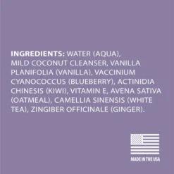 Water (Aqua), Mild Coconut Cleanser, Vanilla Planifolia (Vanilla), Vaccinium Cyanococcus (Blueberry), Actinidia Chinesis (Kiwi), Vitamin E, Avena Sativa (Oatmeal), Camellia Sinensis (White Tea), Zingiber Officinale (Ginger)