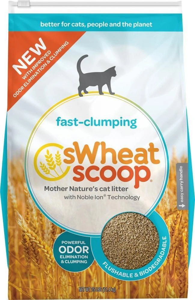 Our fast-clumping sWheat Scoop is nice to cats, but not nice to odor. Made from 100% wheat, fast-clumping utilizes wheat enzymes to eliminate odor and wheat starch to help clump fast.