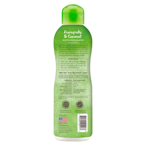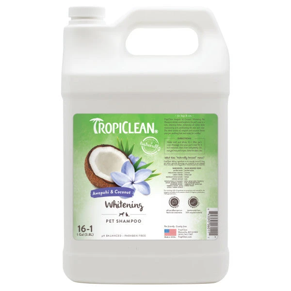 TropiClean Awapuhi & Coconut Whitening Dog & Cat Shampoo whitens and brightens your pet’s coat in a rich, cleansing lather, enhancing all colors while moisturizing and conditioning their skin and coat. The sweet aroma of awapuhi and coconut leaves them smelling fresh and ready for cuddles! TropiClean Pet Products are cruelty free.