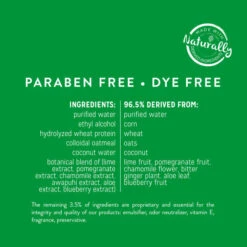 Water, Ethyl Alcohol, Hydrolyzed Wheat Protein, Colloidal Oatmeal, Coconut Water, Botanical Blend Of (Lime Extract, Pomegranate Extract, Chamomile Extract, Awapuhi Extract, Aloe Extract, Blueberry Extract), Emulsifier, Odor Neutralizer, Vitamin E, Fragrance, Preservative