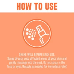 SHAKE WELL BEFORE EACH USE. Spray directly onto affected areas of pet’s skin and gently massage into the coat. Do not spray in the face or eyes. May be used as often as necessary for immediate relief.