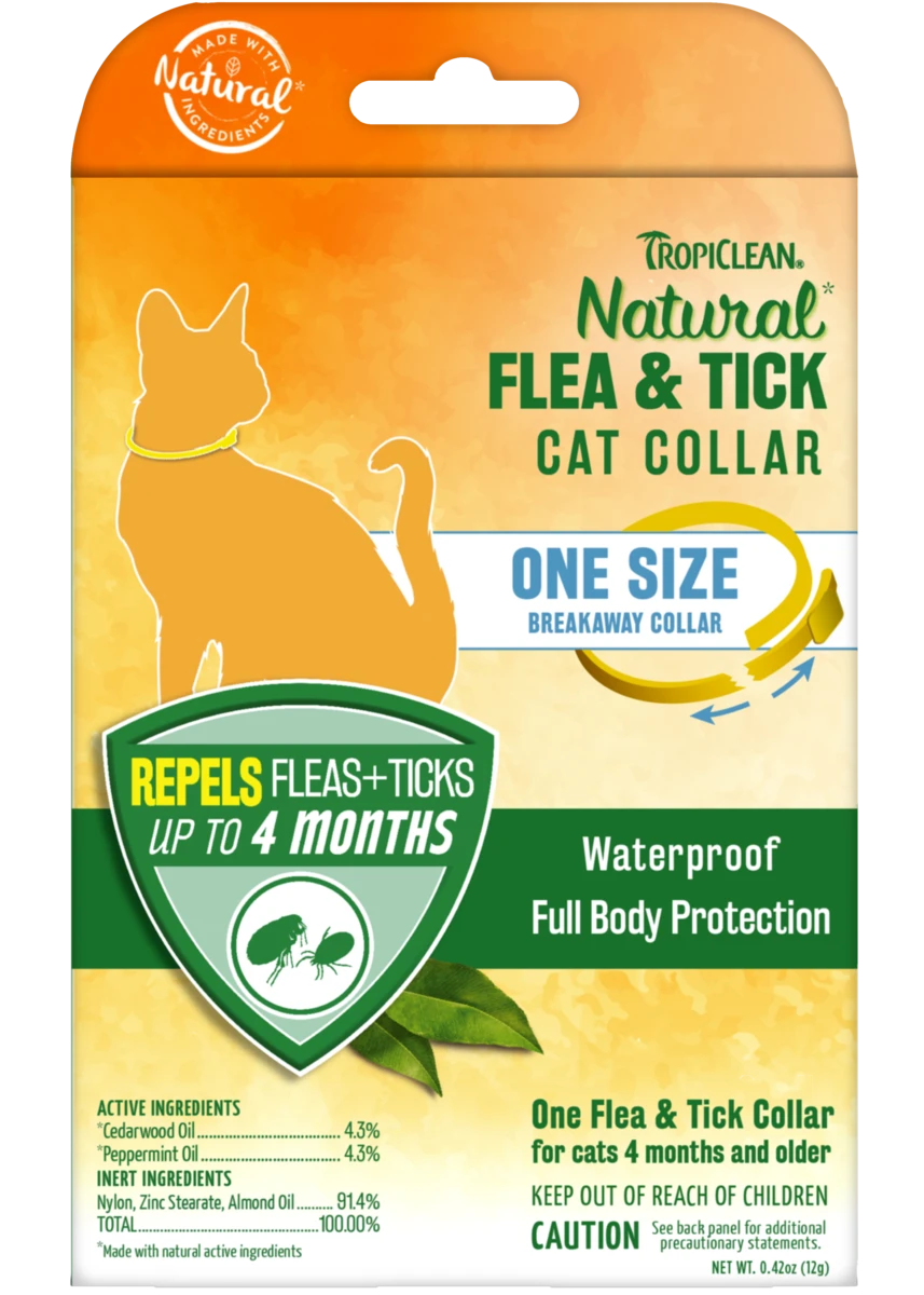 TropiClean Natural Flea & Tick Cat Collar is made with natural active ingredients, cedarwood and peppermint oils, and is safe when used as directed to protect and defend against those irritating fleas and ticks. Our waterproof collar is a full body repellent for cats that effectively protects your furry friend.
