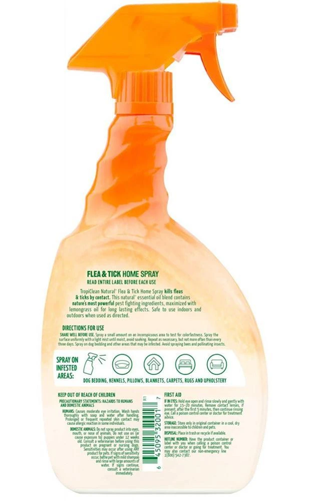 TropiClean Natural* Flea & Tick Home Spray is guaranteed to kill fleas and ticks by contact and can be sprayed directly on carpet, furniture, and bedding to prevent pests indoors. This natural essential oil blend contains some of natureās most powerful pest-fighting ingredients, maximized with lemongrass oil for long-lasting repellent effects. When used as directed, Home Spray is suitable to use around dogs and cats. Use with other Natural* Flea & Tick products including Max Strength Shampoo and Dog & Bedding Spray for additional pest protection. *Made with natural active ingredients