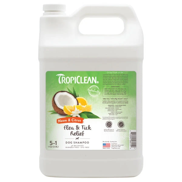 TropiClean Neem & Citrus Flea & Tick Relief Dog Shampoo provides soothing relief from flea and tick irritations, while effectively degreasing extremely dirty dogs. Flea shampoo removes deep rooted dirt, debris, and grease from the coat without stripping your dog’s skin of its natural oils. Leaving their coat soft and clean. The calming citrus aroma leaves them smelling fresh and ready for cuddles! TropiClean Pet Products are cruelty free.