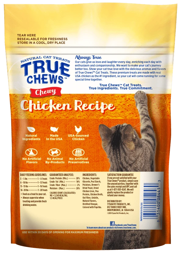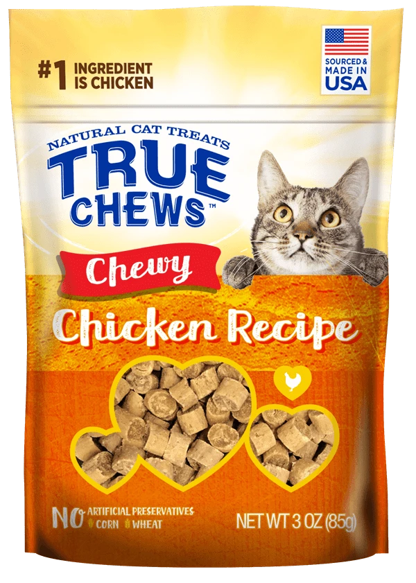 Your favorite feline will love to get their paws on the real-chicken taste of our tender cat treats. These chewy little morsels are made with no artificial flavors or preservatives, just USA-sourced chicken and other natural ingredients.
