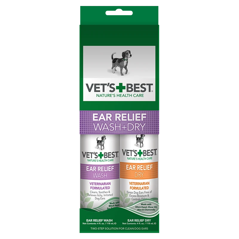 Ear Relief Dry Directions for Use: Clean ears with Vet’s Best Ear Relief Wash. Shake well. Apply to openings of ear canals. Massage base of ears to distribute solution into ear canals. Solution will dry to a soft powder. Repeat regularly as needed to maintain clean, odor-free ears. Also use before and after bathing or swimming. Avoid contact with eyes. Not recommended for use on cats or nursing/pregnant dogs.