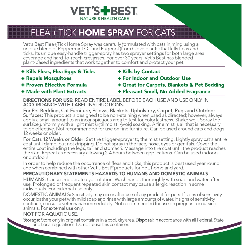 VET’S BEST FLEA AND TICK HOME SPRAY FOR CATS kills fleas, flea eggs, and ticks by contact. Our formula also repels mosquitos!