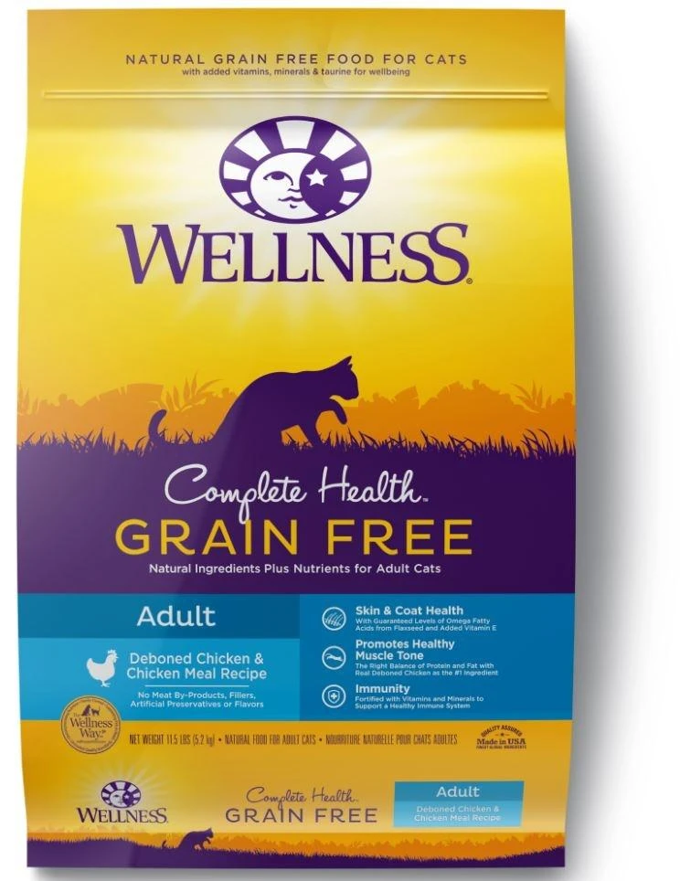Wellness Complete Health Grain Free recipes feature natural ingredients plus super nutrients for adult cats. These delicious recipes are formulated with a balanced blend of proteins, grain free carbs and select fats, providing the energy your cat needs to thrive.